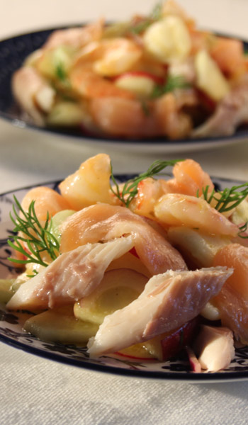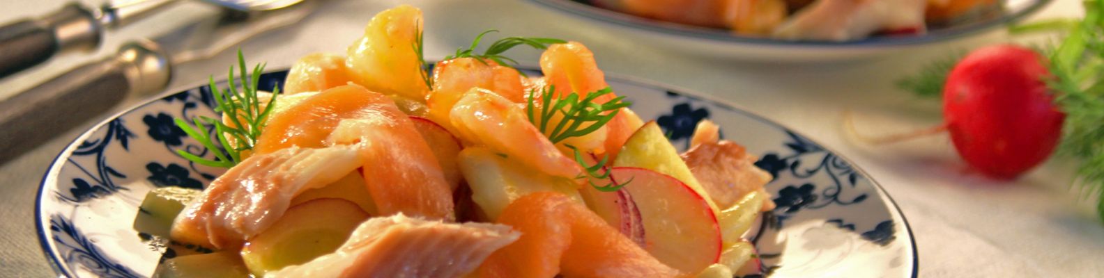 Lachs und Forelle in Stücke schneiden und mit Nudeln, Garnelen, Äpfeln, Gurke, Radieschen, Zwiebel und der Vinaigrette vermengen. Den Salat in eine Schüssel füllen und mit dem restlichem Dill garnieren.
