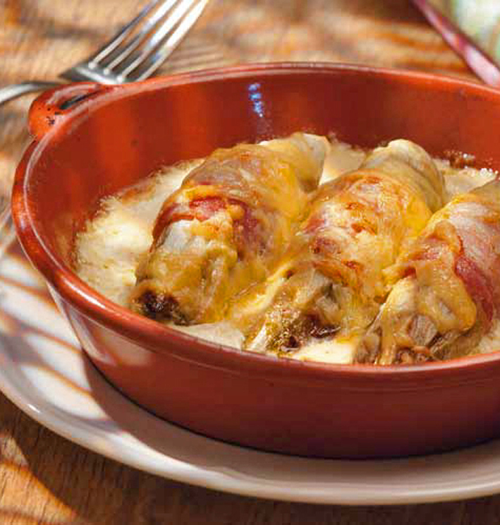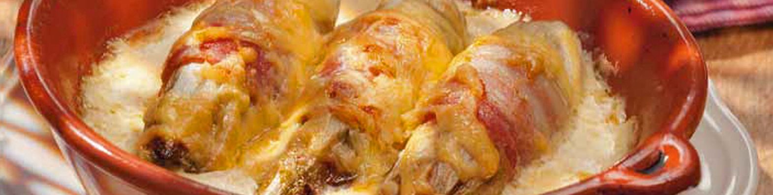 Die Stauden mit Schinken umwickeln und in eine gefettete Auflaufform geben. Mit der Sauce übergießen und mit Käse belegen. Den Auflauf im vorgeheizten Backofen bei 200 °C ohne Luft ca. 25 Minuten backen, bis der Käse eine goldbraune Farbe angenommen hat.