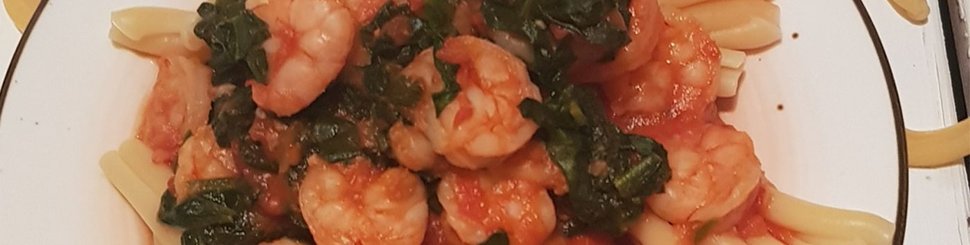 5 ist heute meine Lieblingszahl! Mit 5 Zutaten in 15 Minuten = Essen fertig! Die Nudeln zähl ich nicht mit, die kochen ja von alleine. Für die Garnelen mit Spinat und Tomaten braucht man Garnelen, Spinat, Knoblauch, Tomatensaft oder stückige Tomaten und eine Bio Zitrone. Ein bisschen Salz, Pfeffer und Zucker dazu und das wars.