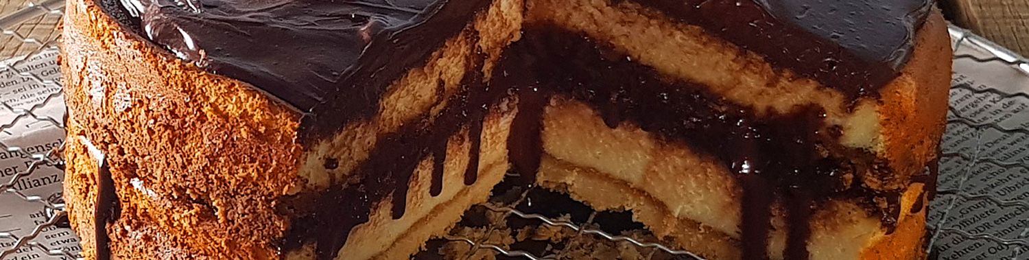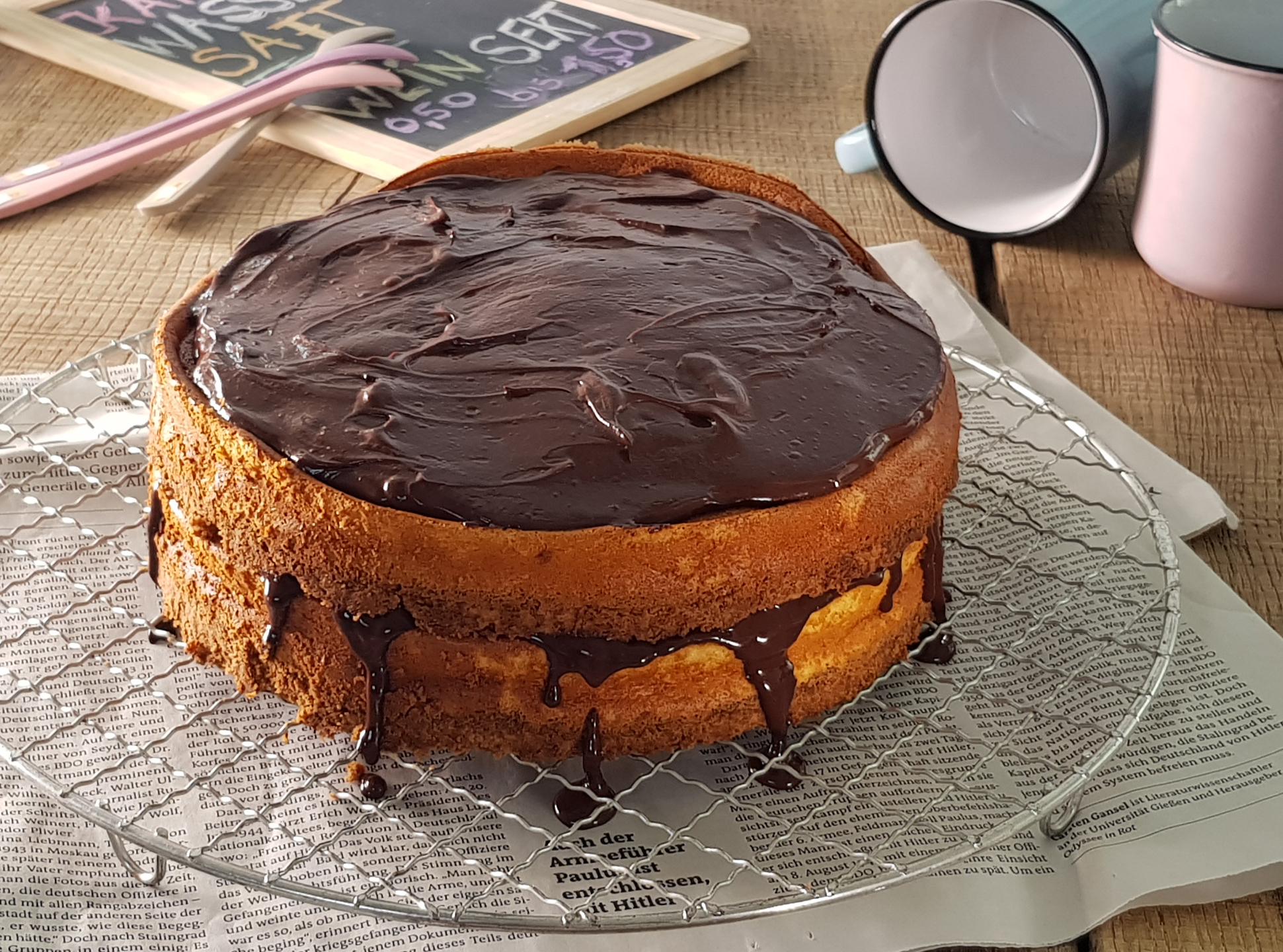 Einen Cheescake auf eine Platte setzen und mit der Ganach bestreichen. Den zweiten darauf setzen und wieder mit der Ganache bestreichen oder wir hatten sie noch zähflüssig und haben sie einfach drauf laufen