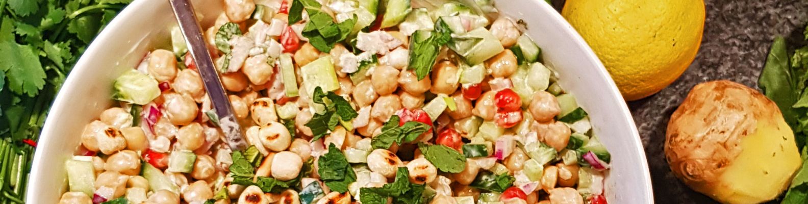 Kichererbsen, Gurke, Granatapfel die Zwiebel in einer Schüssel vermengen. Die Minzeblätter fein hacken. Den Ingwer mit einem Löffel schälen und auf einer Kronenreibe fein reiben. Den Joghurt mit Ingwer, Limetten-/Zitronensaft, Kreuzkümmel, Asefoedita, Chilipulver und Minze verrühren. Mit Salz und Zucker abschmecken.