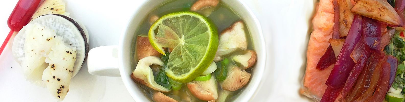 Den Fischfond erhitzen und den Tee damit zubereiten. 1 Minute ziehen lassen, dann in jede Schale 150 ml Tee gießen. Mit je einer Scheibe Limetten servieren.