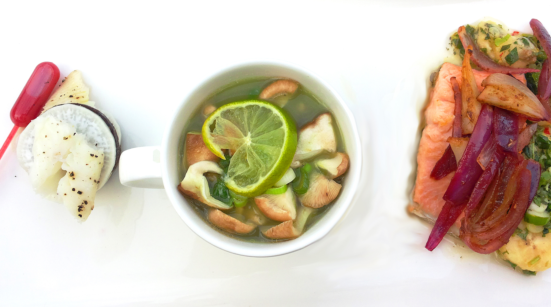 Hier haben wir in unserem Fisch Kochkurs für jeden Sinn eine Kleinigkeit auf dem Teller. Cremig schmeichelnder Bananensalat mit Chili und Minze, krosse Curry Zwiebeln, heiße Suppe mit Matcha verfeinert, geräucherter Heilbutt mit gekühlter Himbeer Vinaigrette und leicht scharfem Rettich. Hier kommen die Rezepte zum Bild. Teilweise sind Sie etwas abgewandelt oder ein paar Zutaten wurden zugegeben.