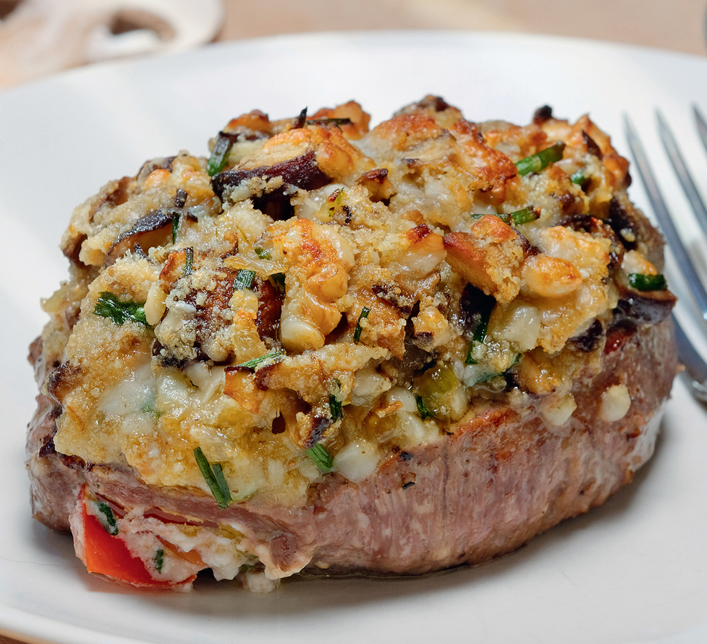 Für die Kruste Nüsse, Pilze sowie die Kräuter mittelfein hacken. Mit der Butter mischen und solange Paniermehl zugeben, bis alles sichtbare Fett aufgesogen ist. Mit Salz und Pfeffer abschmecken.