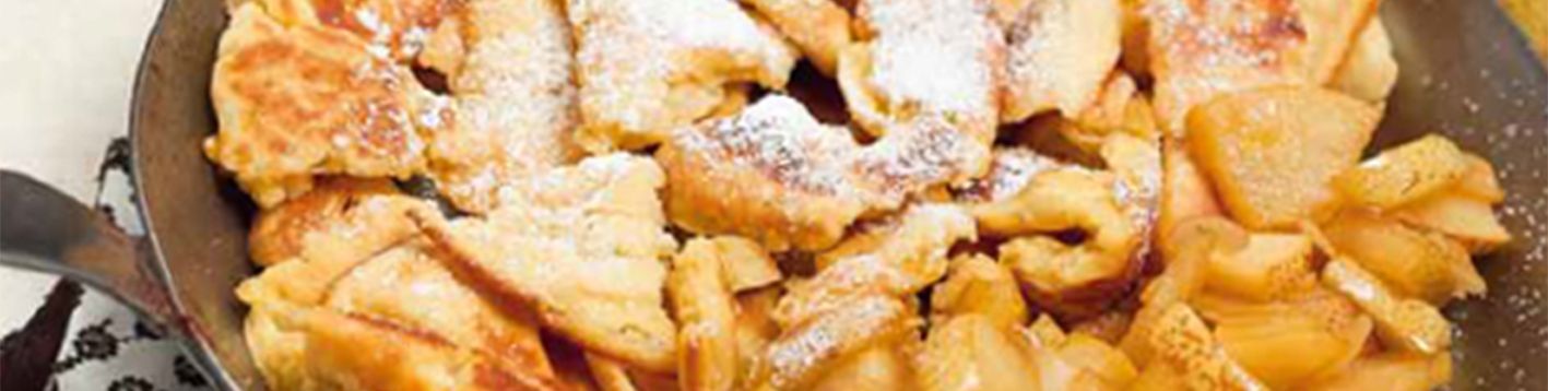 Den Backofen auf 200 °C vorheizen. 1 EL Butter in einer ofenfesten Pfanne erhitzen und den Teig ca. 1 – 2 cm hoch hineingießen. Das Ganze auf mittlerer Schiene in den Ofen geben und backen. Sobald der Teig an der Oberfläche trocknet und fest wird, einen weiteren Esslöffel Butter darauf träufeln. Anschließend den Teig wenden und auf der anderen Seite weiterbacken. Wenn die Oberfläche goldbraun ist, die Pfanne aus dem Ofen nehmen und den Teig mit einer Gabel zerreißen. 2 EL Puderzucker hineingeben und ein paar Butterflöckchen obenauf verteilen. Dann wieder in den Ofen geben und leicht bräunen lassen.