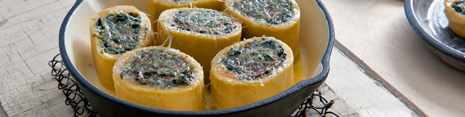 DEN TEIG so dünn wie möglich zu einem Rechteck ausrollen. Dazu den Teig mit Mehl bestäuben. Der Teig sollte ungefähr so groß wie ein Küchentuch sein. Den Teig auf ein sauberes Küchentuch geben und quer vor sich hinlegen. Den Spinat auf dem Teigblatt verteilen, dabei 5 cm oben am Rand freilassen. Den Parmesan darüberstreuen.