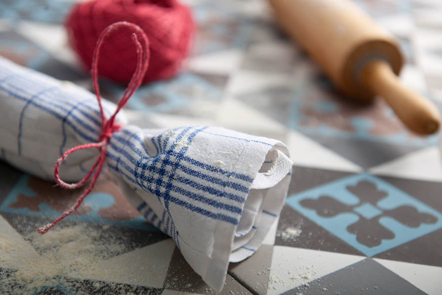 DEN OBEREN, freien Rand mit Wasser bestreichen und von unten beginnen, die Nudelrolle aufzuwickeln, genauso wie bei einer Biskuitrolle. Dazu einfach das Küchentuch anheben und es geht fast wie von selbst. Die fertige Nudelrolle fest in das Küchentuch wickeln und an beiden Enden mit Küchengarn zubinden. Dann beide Enden mit einer langen Schnur verbinden und so einen „Griff“ für die Nudelrolle herstellen, um sie später bequem wieder aus dem Topf heben zu können.