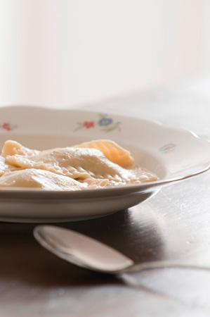 Mehl, Eier, etwas Wasser und Salz zu einem geschmeidigen Teig verarbeiten. Ca. 30 Minuten ruhen lassen. Dann den Teig ca. 3 mm dick ausrollen (geht gut mit der Nudelmaschine). Danach entweder 10 x 10 cm große Teig-Quadrate herausschneiden oder mit einem Glas (großer Durchmesser) die gewünschte Form ausstechen.