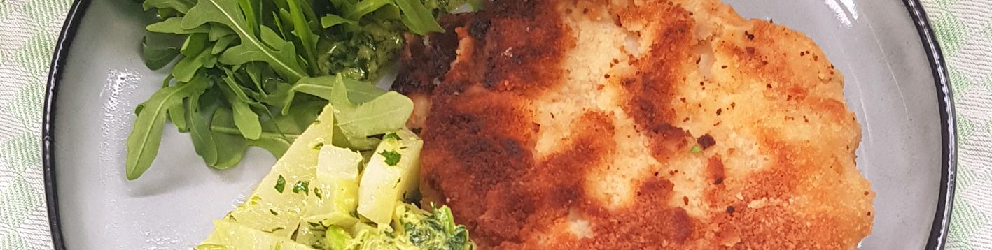 Eine Schale mit verrührtem Ei vorbereiten. Eine Schale mit Semmelbrösel und eine Schale mit dem Mehl. Ich gebe immer schon etwas Gewürz in das Ei. Nochmal verrühren. Nun werden die "Schnitzel" erst in dem Mehl gewendet, abgeklopft, dann im Ei und zum Schluss in den Semmelbrösel. Wer gerne die Panade dicker mag kann noch Mal Ei und Semmelbrösel machen.