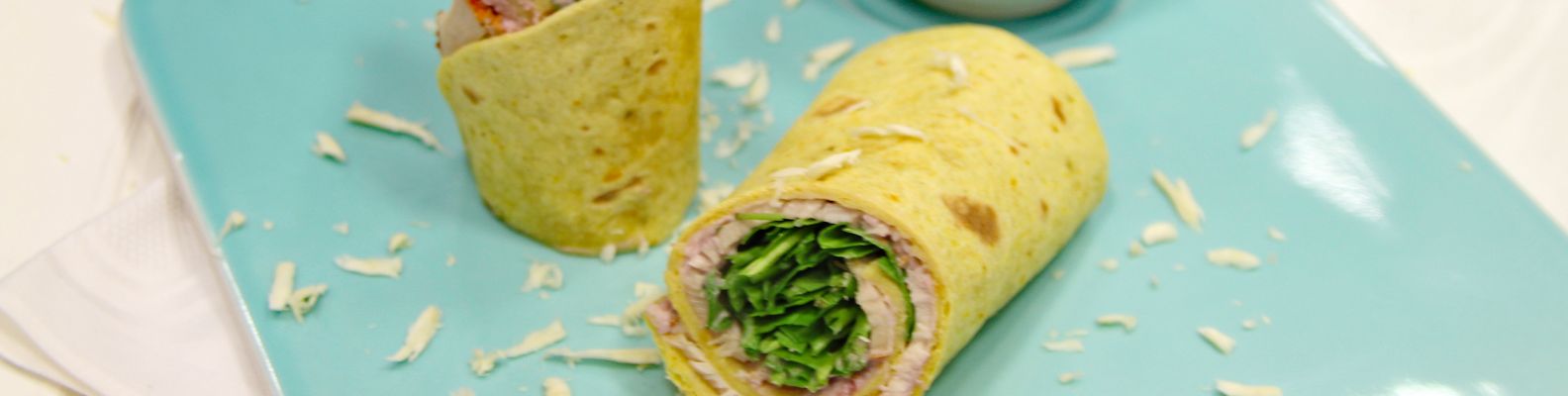 Unser Wrap ist mit Hähnchen, Rucola und Meerrettich-Preiselbeer-Frisch