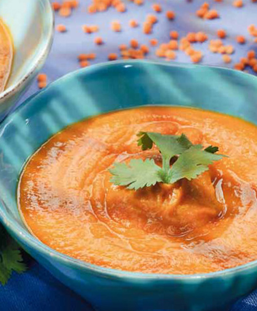 Kichererbsen, Rote Linsen, Tomaten, Möhren, Süßkartoffeln, Steckrübe usw. Es kann alles an Gemüse in den Topf, was sich weich kochen und pürieren lässt.