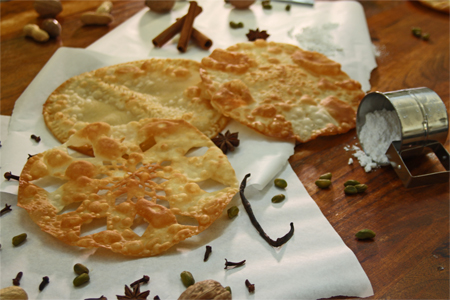 Diese Brote sind traditionell sehr dünn - ein guter Weg, um zu sagen, ob der Teig dünn genug ausgerollt ist, man sollte die Überschriften (manche sagen den Text!) einer Zeitung durch sie lesen können. Schneiden Sie den Teig kreisförmig, mit einem mittelgroßen Teller als Leitfaden, aus. Wenn sie ungebacken aufbewahrt werden müssen, mit Backpapier zwischen den Lagen stapelnund in einer Tüte im Kühlschrank verwahren. Dekoriert werden sie, indem Muster ausgeschnitten werden.